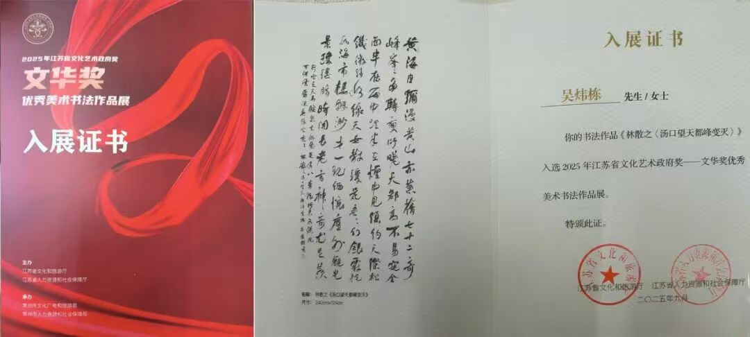 作为江苏省政府正式批准设立的专业艺术最高奖项,“文华奖”以其鲜明的导向性、高度的权威性著称,获奖作品需深度契合时代主题,兼具扎实学术根基与突出创作水准;而第二届中国书法大厦杯行书展、“散之风神”第二届中国书法学术提名双年展均为国内书法界极具影响力的专业赛事与学术展览,汇聚了全国众多优秀书法创作者。吴炜栋在一年内同时斩获“文华奖”殊荣并入选两大权威展览,不仅是对其数十年深耕书法艺术的专业认可,更印证了其作品在业界的广泛影响力和深厚艺术造诣,也是金坛盟员立足本职、赋能文化建设的生动实践。
