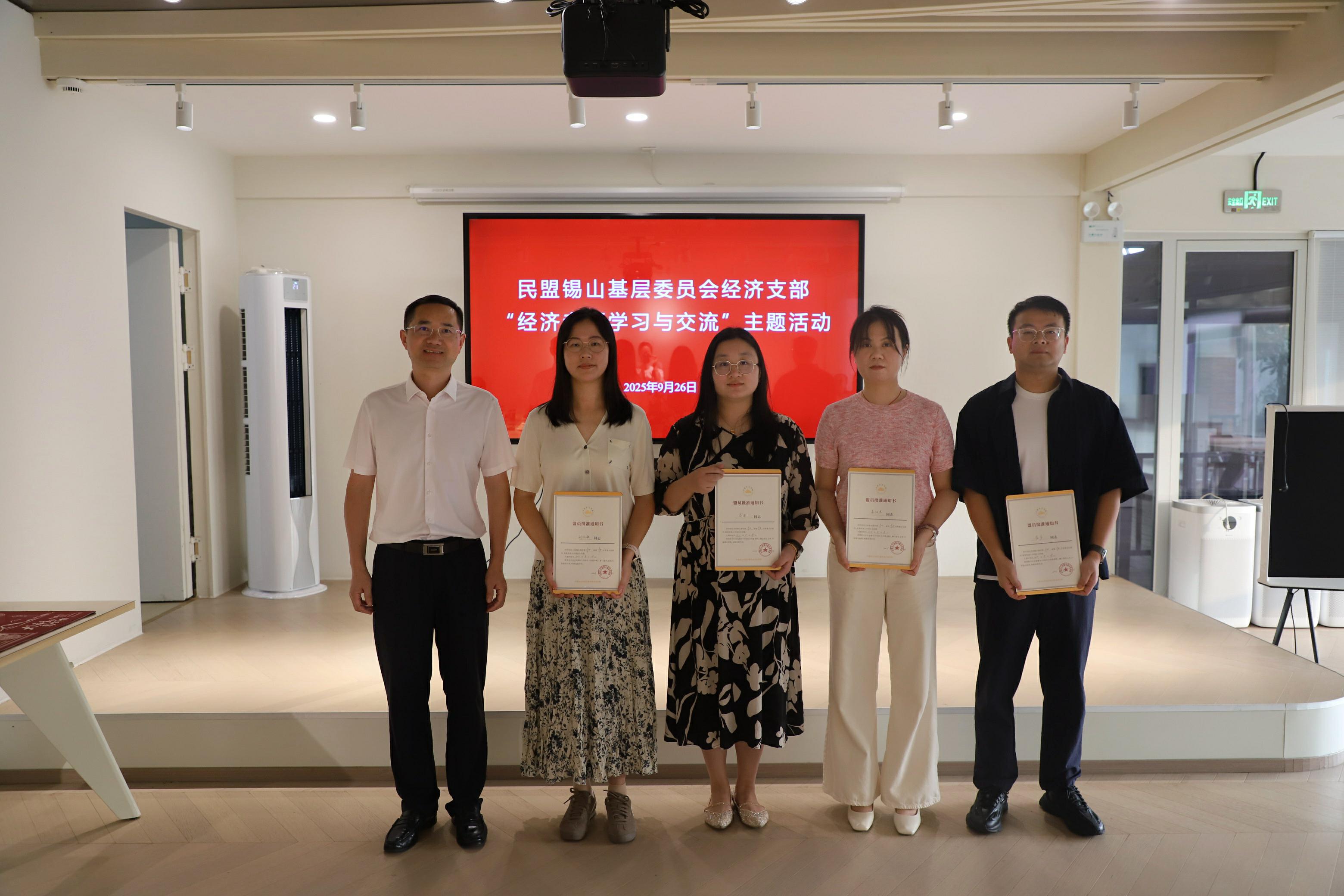 民盟锡山区基层委员会主委郭明州为2025年新盟员隆重颁发入盟证书。接过证书的那一刻,新盟员们脸上洋溢着自豪与坚定,纷纷表示将以成为一名民盟盟员为新的起点,加强学习、提升能力,尽快融入组织、履职尽责,为支部发展和锡山建设贡献自己的力量。
