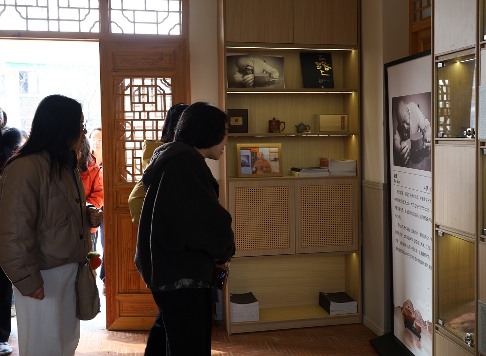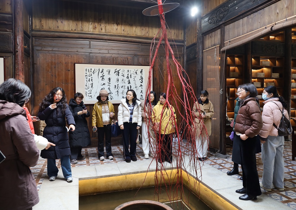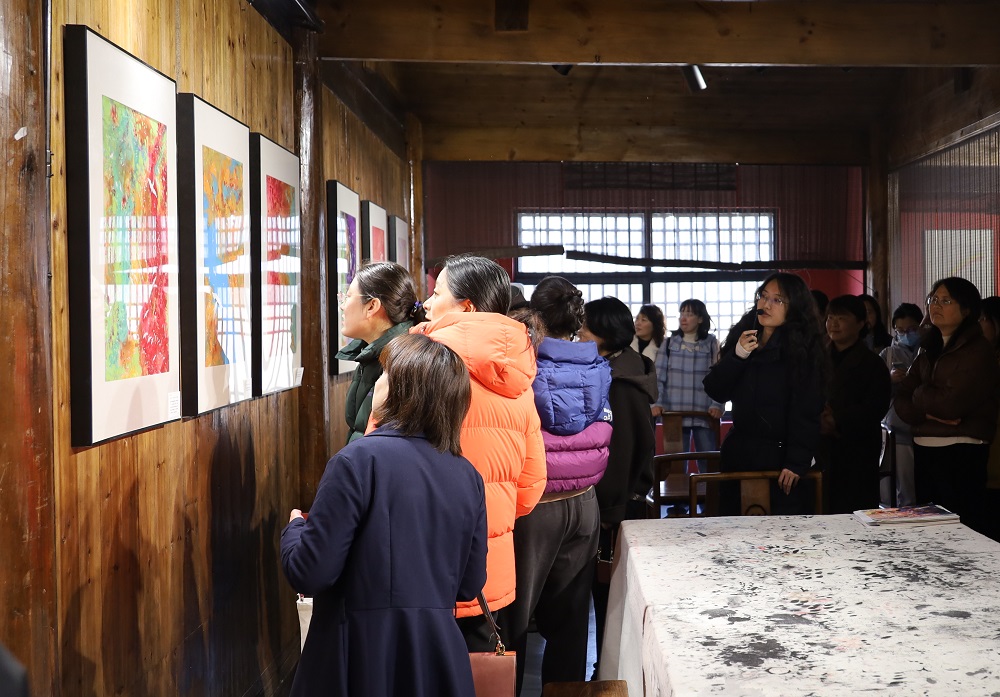 在各艺术展厅,盟员们不仅驻足欣赏了复刻的梵高、莫奈等世界艺术大师的作品,还近距离观赏了众多描绘本土风情的绘画、摄影、书法及紫砂陶艺作品,沉浸式感受多元艺术的独特魅力。绘画作品中,既有展现黄海湿地丹顶鹤、滩涂风光的本土佳作,也有兼具创意与内涵的当代画作,笔墨间尽显自然之美与人文情怀;书法作品涵盖楷书、行书、草书等多种字体,或端庄大气、或飘逸灵动,笔力遒劲间传递着中华传统文化的深厚底蕴;紫砂陶艺作品则以中国工艺美术大师葛军的作品为代表,其独创的“色饰法”让传统紫砂焕发现代生机。大家一边参观,一边交流感悟,在艺术的浸润中拓宽了视野,增进了彼此的情谊。