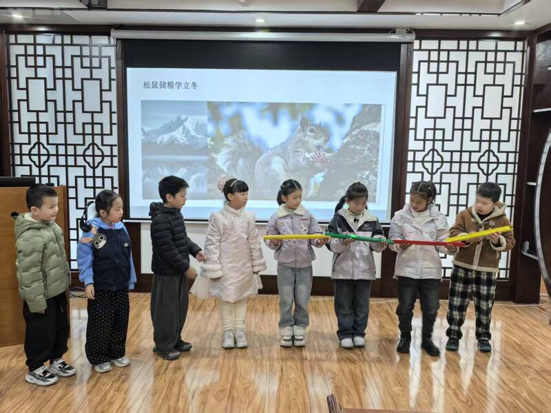 活动伊始,韩利老师以“松鼠忙存粮”的趣味互动游戏,瞬间点燃了现场气氛。孩子们在欢声笑语中模仿小松鼠忙碌储备食物的情景,直观地感受到“立冬”节气万物收藏、准备过冬的物候特点,理解了立冬作为冬季起始的意义。