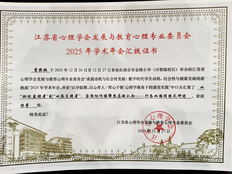 此次双奖佳绩,不仅是曹照鹏个人专业能力的体现,更是民盟镇江市委会多年来鼓励盟员立足本职、服务社会、贡献专业智慧的生动缩影。未来,市委会将进一步凝聚主界别力量,充分发挥教育领域专业人才密集的优势,持续深化社会服务内涵,助力青少年心理健康服务体系化、专业化建设,为培养全面发展的时代新人、推动教育事业进步贡献更多的民盟智慧与力量。