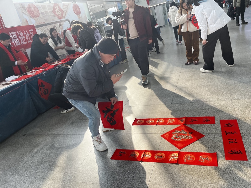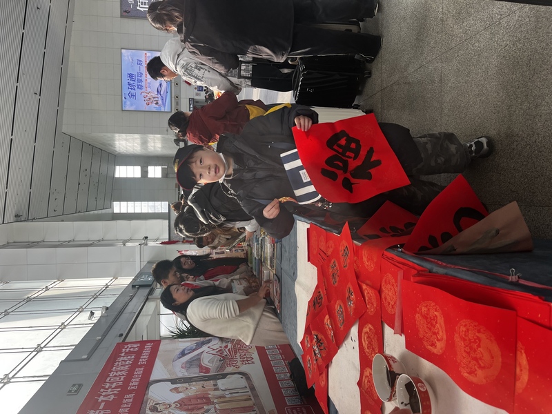 活动现场,墨香四溢,盟员书法家与入盟积极分子齐聚一堂,在站厅内挥毫泼墨。他们笔走龙蛇,将对新年的美好期许和祝福融入笔端,一幅幅寓意吉祥、对仗工整的对联和一个个饱满圆润、饱含深情的“福”字跃然纸上。这些充满艺术气息的作品,吸引了众多旅客的目光,大家纷纷驻足观赏,旅客们一边耐心等待定制的对联,一边欣赏传统文化的独特韵味与书法艺术的魅力。旅客们品味着对联中的美好寓意,脸上露出微笑,现场气氛热烈。更有旅客被现场氛围所感染,兴致勃勃地亲自拿起毛笔,在书法家们的指导下,体验着书法创作的独特乐趣。