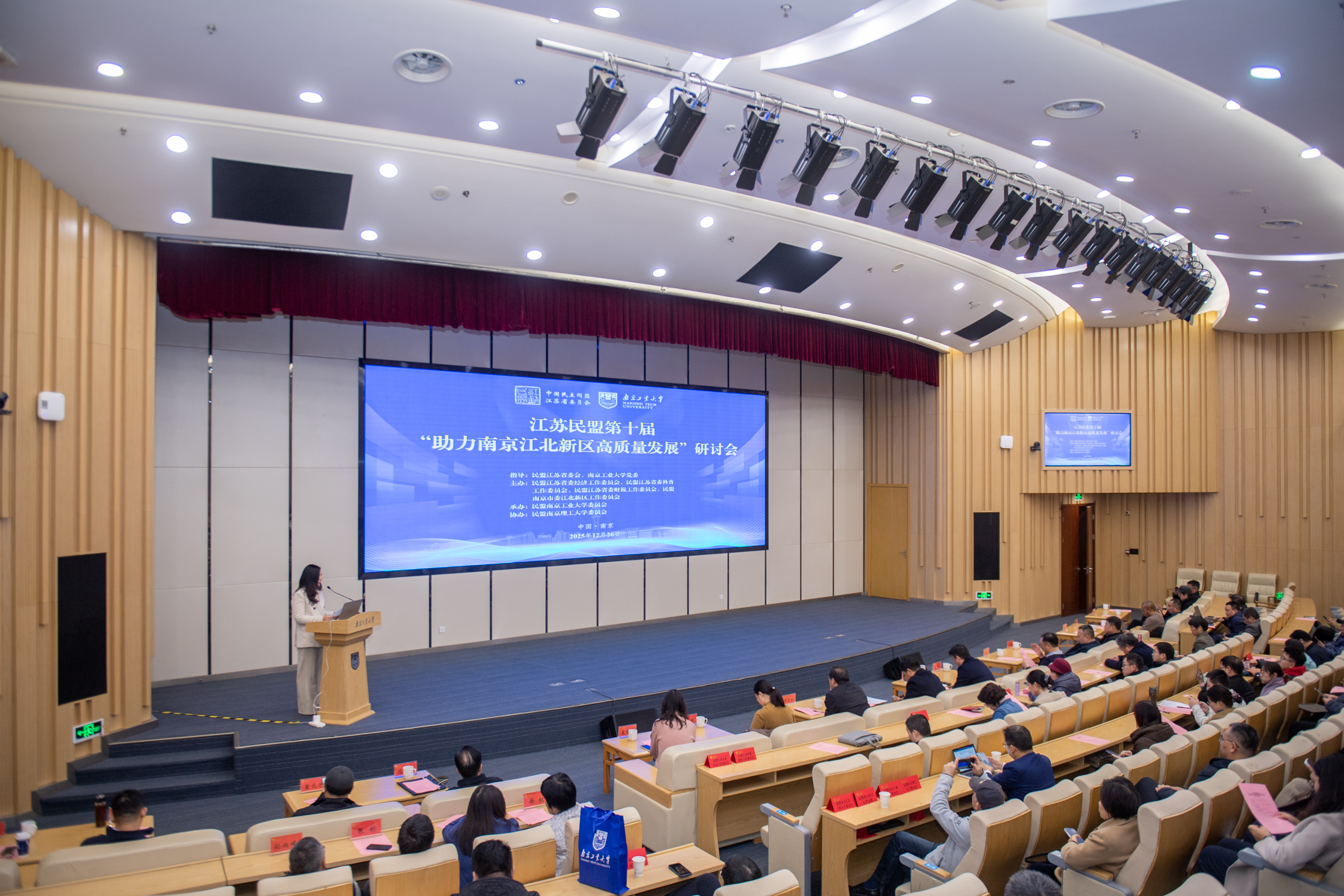 12月26日下午,江苏民盟第十届“助力南京江北新区高质量发展”研讨会在南京工业大学江浦校区举行。本次研讨会由民盟江苏省委会、南京工业大学党委指导,民盟江苏省委经济工作委员会、财税工作委员会、科普工作委员会、民盟南京市委江北新区工作委员会主办,民盟南京工业大学委员会承办,民盟南京理工大学委员会协办。江苏省政协副秘书长、民盟省委专职副主委冯泉、南京工业大学纪委书记曹杰、民盟江苏省委副主委黄贤金、江北新区党工委宣传和统战部副部长严静及省委统战部、南京市统战部、民盟省委等单位部处领导,以及来自民盟省委相关专业委员会、南京工业大学、南京信息工程大学、南京审计大学、南京理工大学、南京江北新区等基层组织的盟员代表等近百名嘉宾、专家、学者出席会议。民盟南京工业大学委员会、南京工业大学研究生院副院长谢婧婧主持会议。