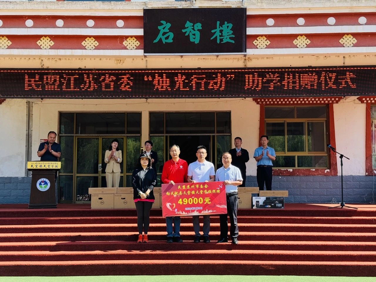 为积极响应民盟中央“农村教育烛光行动”号召,结合“凝心铸魂强根基、团结奋进新征程”主题教育要求,7月1日至4日,根据民盟江苏省委会的统一安排,民盟苏州市委会与常州市委会、徐州市委会、扬州市委会一起赴甘肃省武威市天祝藏族自治县开展教育帮扶活动。民盟苏州市委会专职副主委承创带领苏州民盟企联会一行参加活动。7月3日,捐赠仪式在甘肃省天祝藏族自治县天堂镇天堂学校举行。民盟武威市委会主委牛生葆、民盟甘肃省委会社会服务部部长李本安、民盟天祝县支部主委温占莲、天祝县教科局副局长朵生虎等出席了捐赠仪式。天堂学校是一所九年一贯制民族特色学校,有小学和初中在校生600多人,其中有三分之二是寄宿制学生。根据天堂学校教育教学资源的实际需要,在民盟江苏省委会的统筹下,民盟苏州市委会持续发力,为天堂学校添置了急需的信息化教学设施设备,价值肆万玖仟元。2007年至今十余年来,民盟苏州市委会根据民盟江苏省委会统一安排,一直坚持对口甘肃省天祝藏族自治县开展教育帮扶,开展了捐建新校舍、捐资助学、教师培训、捐赠图书等一系列帮扶活动,持续为天祝的教育事业贡献力量,共筑农村教育光明的未来,让“烛光行动”的火焰永远燃烧,照亮每一个孩子的求知之路,温暖每一颗向往光