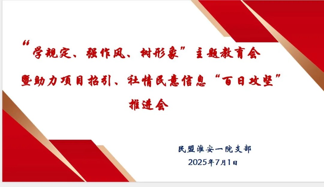 7月1日下午,民盟淮安市第一人民医院支部召开“学规定、强作风、树形象”主题教育启动会暨助力项目招引、社情民意信息“百日攻坚”推进会。江苏省政协委员、市一院副院长徐永、部分盟员出席会议,支部主委吉凤庆主持。