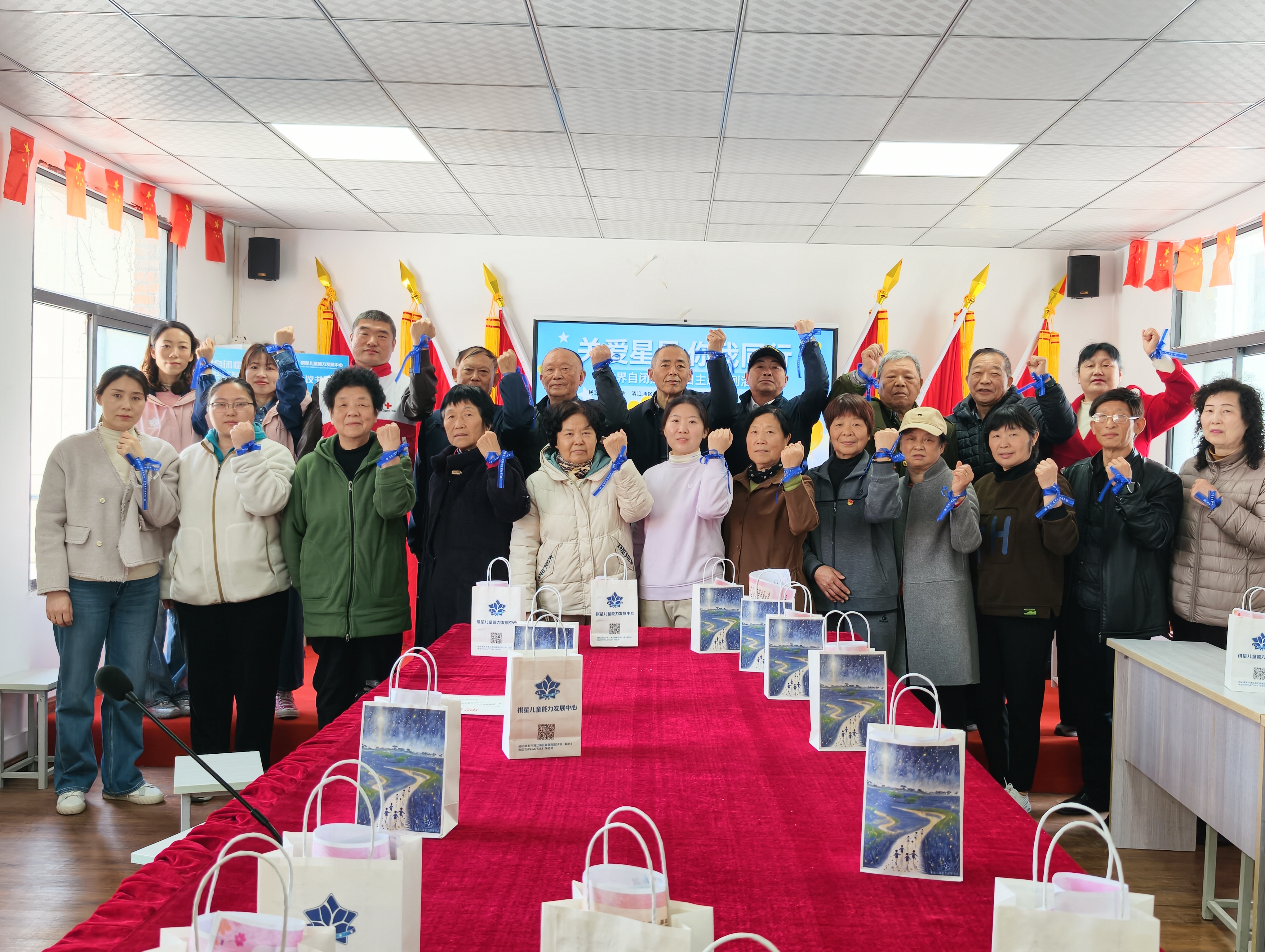 培训结束后,现场举行了简洁而庄重的新志愿者聘任仪式,为新晋公益志愿者颁发聘书,民盟淮安市委会社会服务处副处长、红十字会讲师史强作为志愿者代表上台发言,分享了自己投身公益、关爱特殊群体的初心与期许。全体人员共同宣读《关爱自闭症群体倡议书》,并统一佩戴象征着接纳、理解与关爱的蓝丝带合影留念。