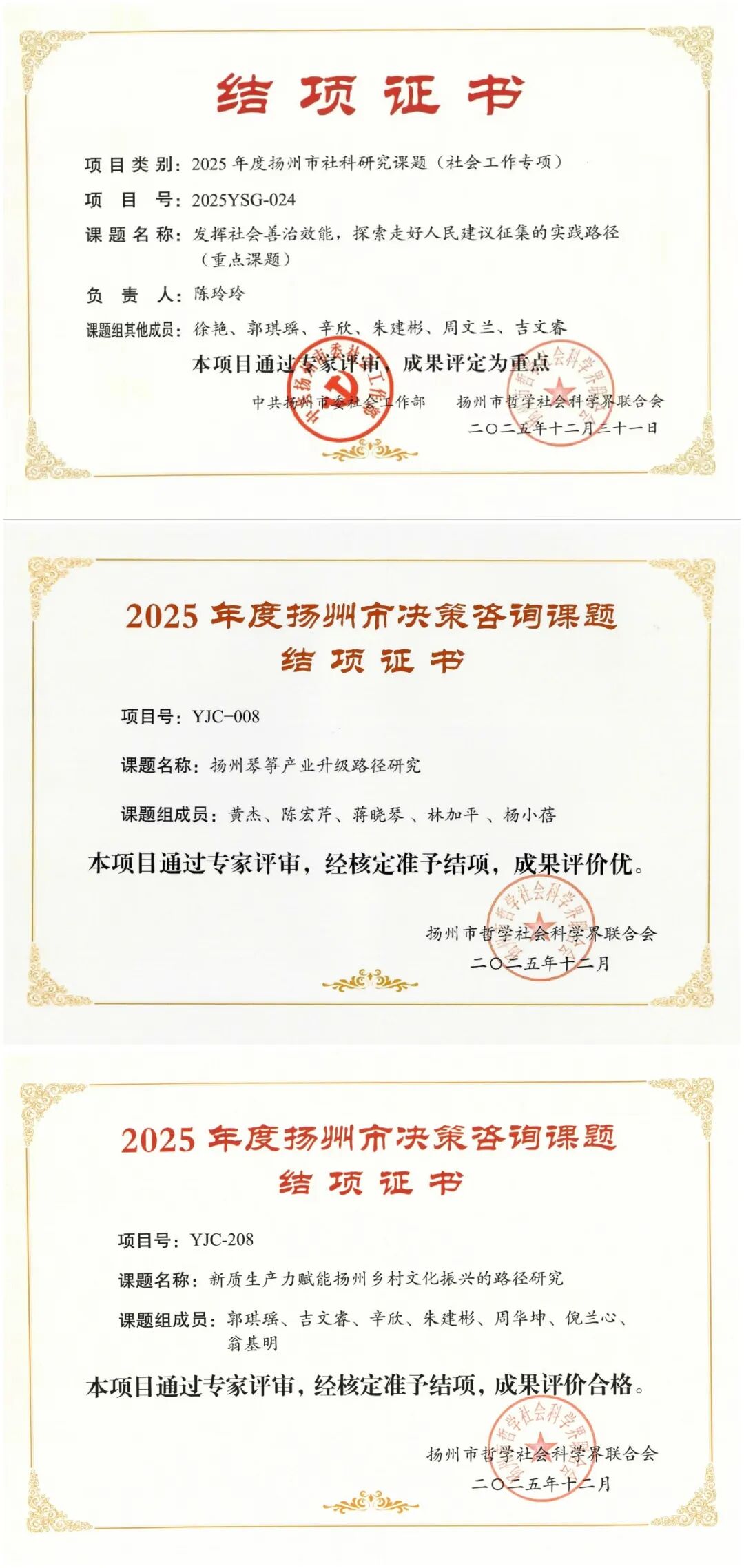 由扬州民盟盟员陈玲玲担任负责人,盟员郭琪瑶、辛欣、朱建彬、周文兰等共同参与的研究课题《发挥社会善治效能,探索走好人民建议征集的实践路径》被列为重点课题;由盟员黄杰、陈宏芹、蒋晓琴、杨小蓓等参与的课题《扬州琴筝产业升级路径研究》,盟员郭琪瑶、辛欣、朱建彬、周华坤、倪兰心等参与的课题《新质生产力赋能扬州乡村文化振兴的路径研究》顺利通过结项评审。